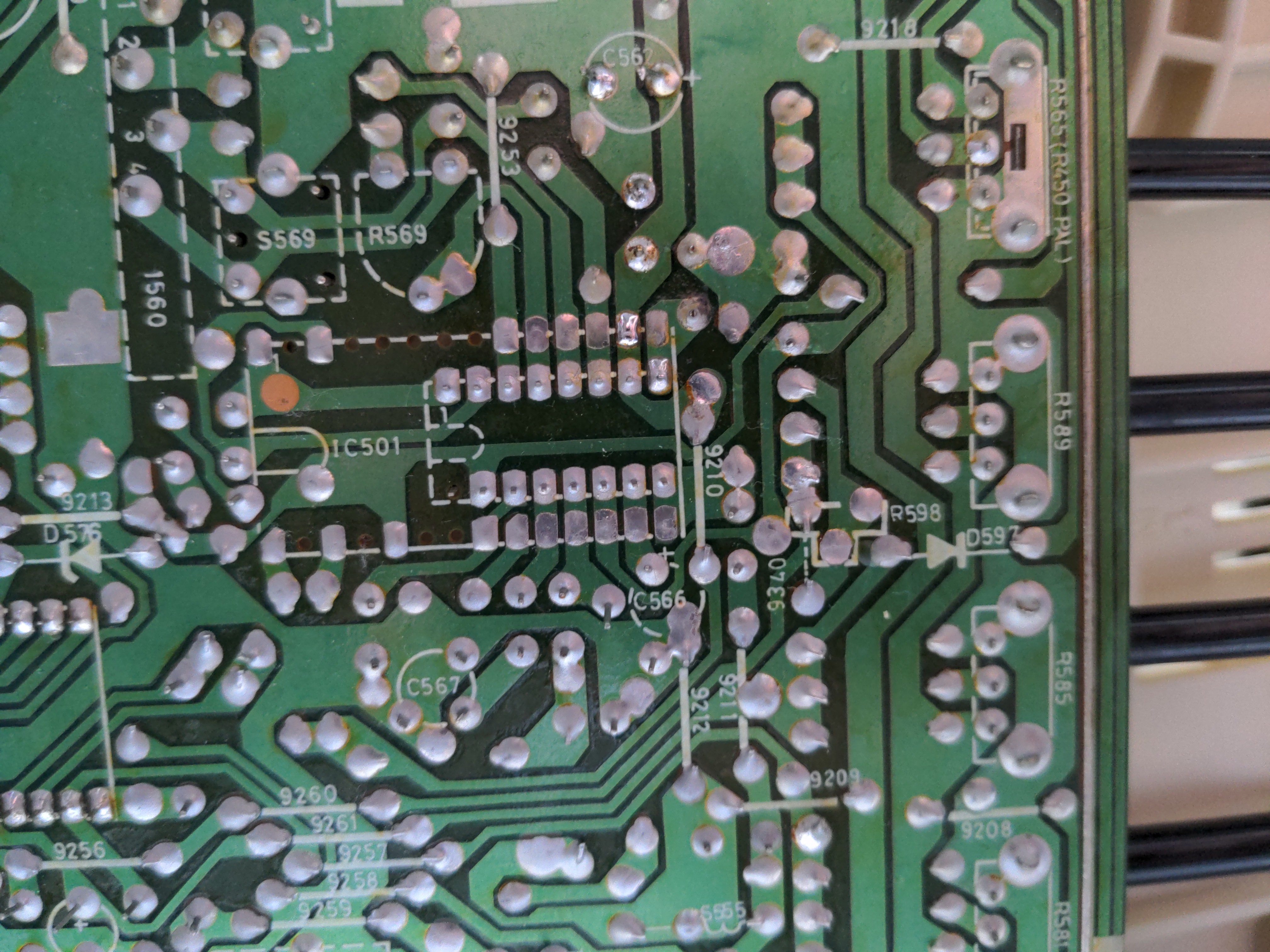 Despite the color fix, I noticed the screen would intermittently blink, with the image shaking slightly and occasionally narrowing. After additional investigation, I suspected capacitor issues in the power supply lines feeding the CRT’s RGB output transistors. I replaced the largest capacitor, C473 (4.7uF), but the problem persisted. I invested some more time into identifying cold joints and I reflowed few of them. The screen stopped blinking, finally.