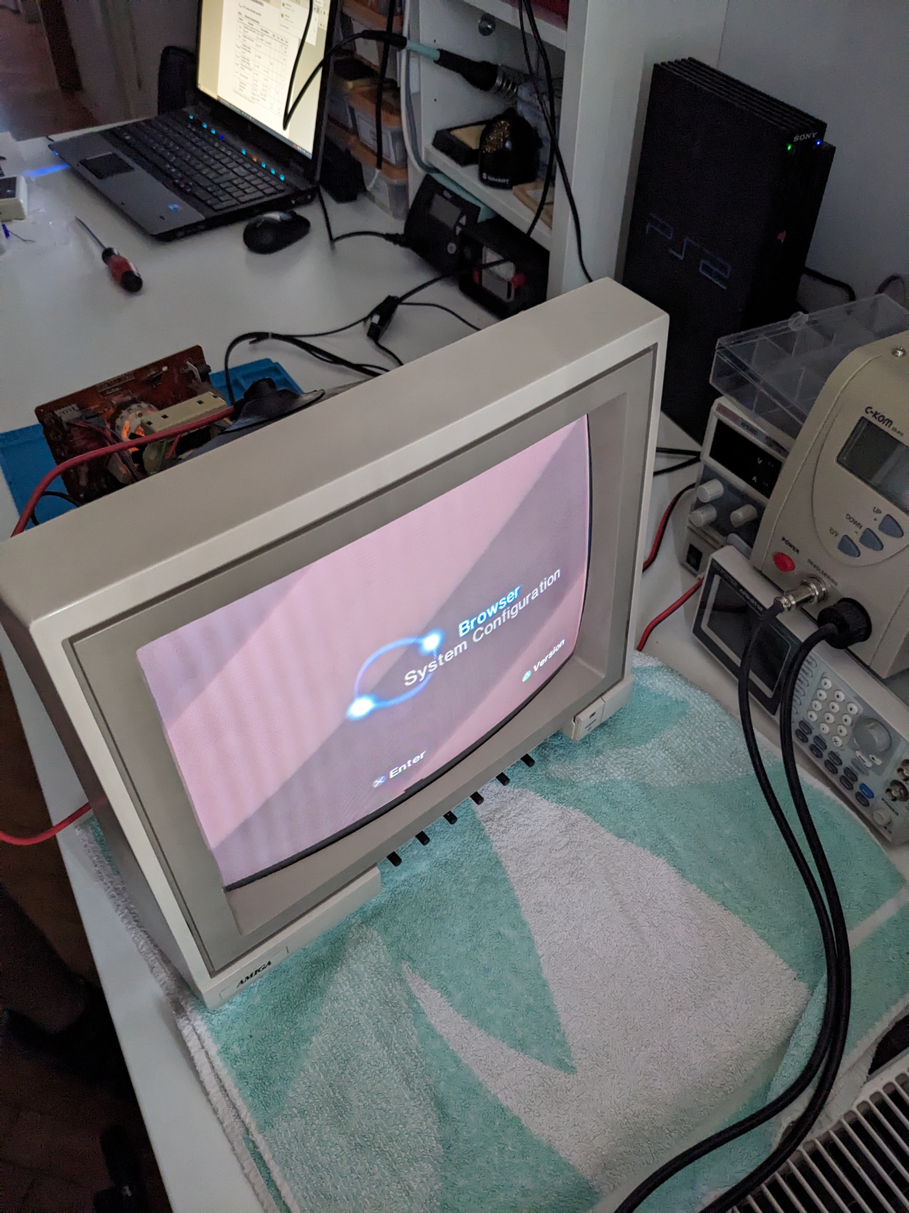 There are still a few adjustments I’d like to make to improve the picture quality. According to the service manual, I need proper test patterns to adjust the image geometry and colors accurately. I’m exploring ways to inject test patterns through the video input, possibly using an old laptop with S-video output or tools like the 240p Test Suite. The image does look a bit reddish.